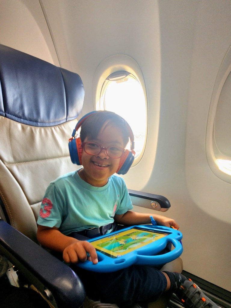 Dante eligió la ventana, fascinado por los aviones. Para mantenerlo entretenido, llevamos audífonos, tableta, fidgets favoritos, snacks y agua. Aunque en casa Dante usa trusas de entrenamiento, en el avión llevó pañal para evitar estrés adicional.
